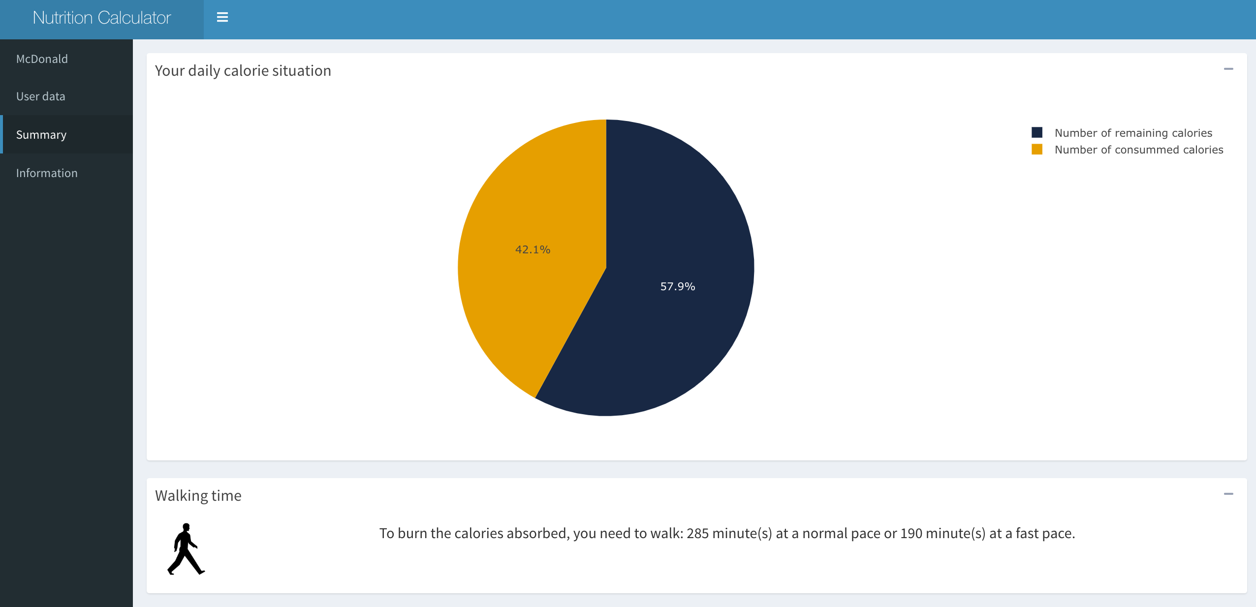 This tab serves as a summary for the consumer. It shows the impact of the number of calories in its McDonald’s menu over its daily total. In this way, he knows how many calories he can still consume. In addition, the walking time necessary to burn off the calories absorbed is computed.